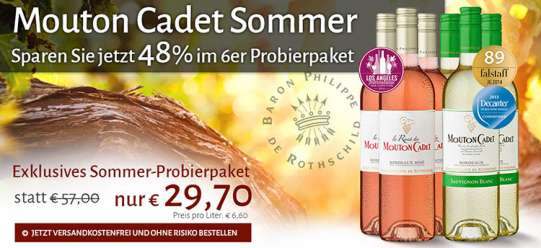 Im Club of Wine gibt es ein Sommerweinpaket in Form von je 3 Flaschen Mouton Cadet Sauvignon Blanc und Le Rosé de Mouton Cadet für 29,70€ inkl. Versandkosten. Regulärer Preis wäre circa 9€ pro Flasche. Die ideale Gelegenheit den Tropfen mal zu probieren icon wink 6er Pack Mouton Cadet im Sommerweinpaket nur 29,70€