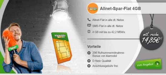 Hier bekommt ihr die Klarmobil Allnet Sparflat 4GB nur 14,85€/Monat als Hero Deal.