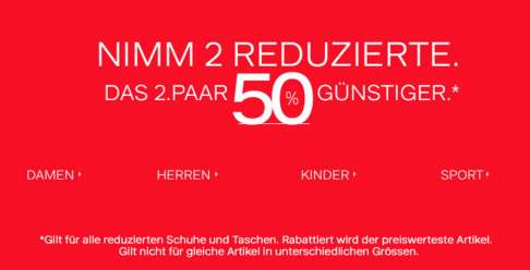 Und gleich der nächste Shop der den Salebereich etwas leeren haben möchte. Bei Deichmann bekommt ihr jetzt 50% Rabatt auf den zweiten Artikel aus dem Sale.