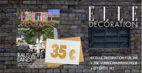 Und noch etwas für die Lesefreudigen. Hier bekommt ihr jetzt 6 Ausgaben ELLE Decoration für 1€, denn als Prämie bekommt man auch hier einen 35€ Verrechnungsscheck und der Preis wird so reduziert.