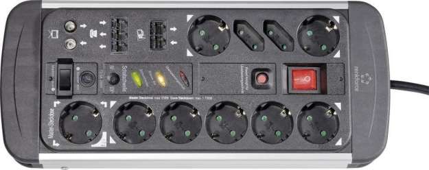Ableitstrom: 9 kA · Anschluss-Leistung: Master: 550 W, Slave: 1700 W (gesamt) · Betriebsspannung (num): 230 V/AC · Einsatzort: Innenbereich · Einschaltschwelle: 8 - 80 W · Farbe: Schwarz,Aluminium · Funktionsanzeige: optisch · Kabel-Typ nach DIN/VDE: H05VV-F 3G 1,5 mm² · Kabellänge: 1.50 m · Kinderschutz: Ja · Material (LOV): Aluminium · Montageart: Montagelöcher · Netzstecker-Typ: Schutzkontakt · Produktabmessung, Breite: 157 mm · Produktabmessung, Höhe: 54 mm · Produktabmessung, Länge: 370 mm · Steckdosen-Anzahl: 10 · Steckdosenleisten-Besonderheiten: Überspannungsschutz,Master/Slave-Funktion,mit Schalter,Kinderschutz · Steckdosenleisten-Typ (Kategorisierung): Master/Slave-Steckdosenleiste · Weitere technische Daten: Standby ca. 0,8W · Überspannungsschutz für: DVB-C, Kabel (Koax),Netzwerk (RJ45),Tel/Fax (RJ11)