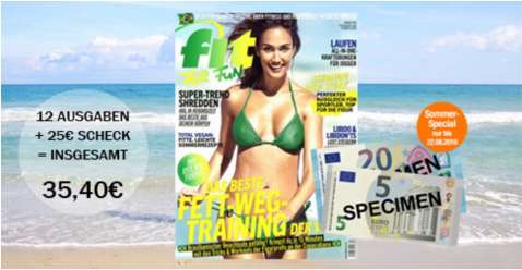 Hier bekommt ihr jetzt das Jahresabo der Fit For Fun schon für 35,40€ aber als Prämie einen 25€ Verrechnungsscheck und zusätzlich nochmal 5€ Rabatt, wenn ihr per Bankeinzug zahlt und so kommt ihr auf einen effektiven Preis von nur 5,40€.