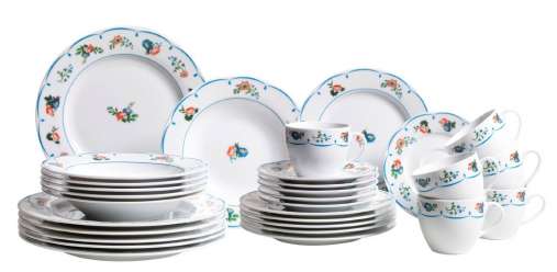 Bestehend aus je 6 Kaffeeobere 230 ml mit Kaffeeuntere 15 cm, Dessertteller 20,5 cm, Teller flach 27 cm und Teller tief 22 cm