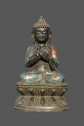 Dharmachakra Mudra ( Geste ): Daumen und Zeigefinger beider Hände (in Brusthöhe) bilden einen Kreis. Sitzender Buddha in filigraner Cloisonne Arbeit. Herkunft: Provinz Sichuan. Material: Bronze